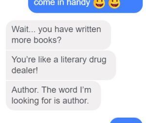 From now on, I’m owning my new identity. If anyone asks me what I do for a living, I’ll tell them straight out: I’m a literary drug dealer. (Bonus points, this fits both writing AND English teaching!! :’D)