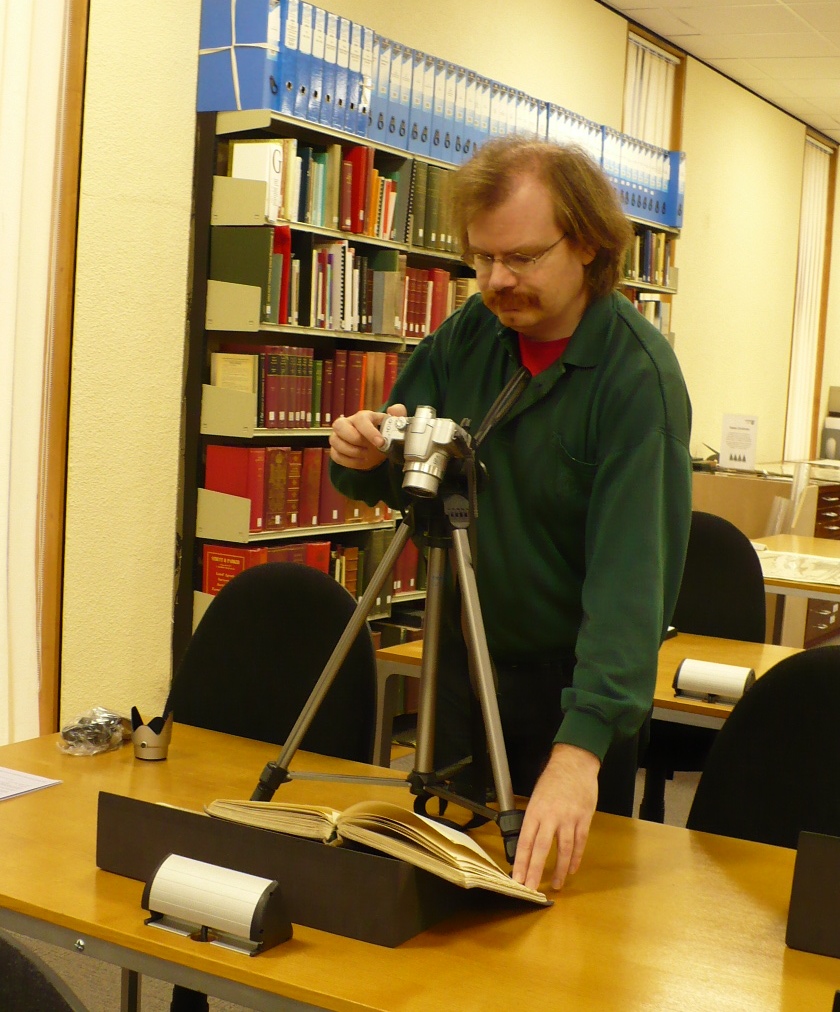 The book consists mainly of fold-out charts, which would be rather awkward to photocopy, so we decided to use my camera. We were allowed to use a tripod, as long as it was entirely on the table. We got a good set of photos, but by the end of the session, my knees were killing me from leaning against the table to see the camera’s screen. (Click here for a photo of me at work.)