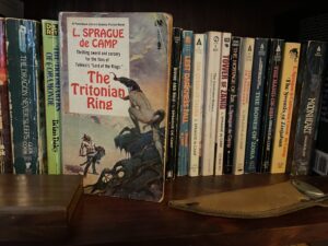 L. Sprague de Camp’s The Tritonian Ring is bronze-age sword-and-sorcery. In its pages he fits in lost continents, suggests origins for certain myths: medusa, gorgons, Amazons, etc., and provides a whirlwind tour of his pre-historic world of anxious, fallible gods, overly arrogant wizards, and bizarre societal habits. The driver of the narrative is the quest of prince Vakar to find the thing the gods fear the most in order to thwart an invasion of his kingdom instigated by the gods. The result is an episodic adventure full of journeys, heists, captures, escapes, duels, and full scale battles, all interspersed with idle dalliances.