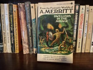 A. Merritt‘s Dwellers in the Mirage is a farrago of elements, blending almost perfectly in a heroic fantasy adventure. I wonder, though, if some of the elements are intended to be taken seriously, or if some were included simply because Merritt was having fun, seeing what he could get away with. I mean we’ve got an octopoid malevolent god from beyond the stars (or another dimension, or something) by the name of Khalk’ru. Ring any bells? We have a lost world, a hidden valley in the Alaskan wilderness hidden beneath a mirage-producing layer of geothermal steam. (Or something like that.) We have the Uighers of western China revealed as the degenerate remnant of a proto-Nordic race, whose unmixed bloodline is later encountered in the lost world. (Note such fantastic cognates as Ayjir for Aesir. Yodin for Odin. A gender-swapped Luka for Loki. Etc. It’s like an Easter Egg hunt hidden within the novel.) Then there are Indian myths, most notably the Little People, also encountered with the mirage-concealed valley.