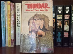 Thundar: Man of Two Worlds was meant as the first in a series, judging by the textual evidence. It is the work of John Bloodstone (that is, Stuart J. Byrne, who labored in the speculative fiction mines in the latter half of the Twentieth Century). Thundar is Edgar Rice Burroughs filtered through Lin Carter. The debt to ERB is evident from the beginning: a narrator revealing how he’d come into possession of the manuscript that provides the bulk of the novel. The debt only deepens with the Tarzan and Caspak elements later on. Lin Carter’s fingerprints show in the gleeful mixture of subgenres: lost world/lost race; time travel; super-science blending with heroic fiction. It isn’t quite as bonkers as the Worlds End books, but doesn’t pull any punches either. All that aside, it was a lot of fun. Quick, fast-paced, and inventive. Unfortunately it leaves many of the mysteries and questions to be answered in the follow-up volume(s) which never appeared.