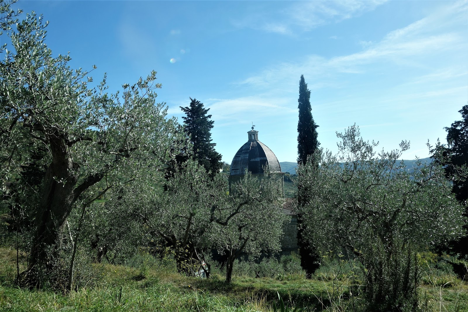 My husband and I piled into our friend’s snappy red Alfa-Romeo for the short drive to Cortona. The town is at the top of my list of places in Italy to spend a day, a weekend, or forever. No matter how many times I visit I always want to return to enjoy the lovely ambience. This time it was a sunny late October day. It was early when we left, wispy bits of ground fog hung on low-lying fields and the distant hills were blue-gray. We wound through silvery-leaved olive groves interspersed with cypress trees and an occasional church as we ascended the steep hill leading to the town center.