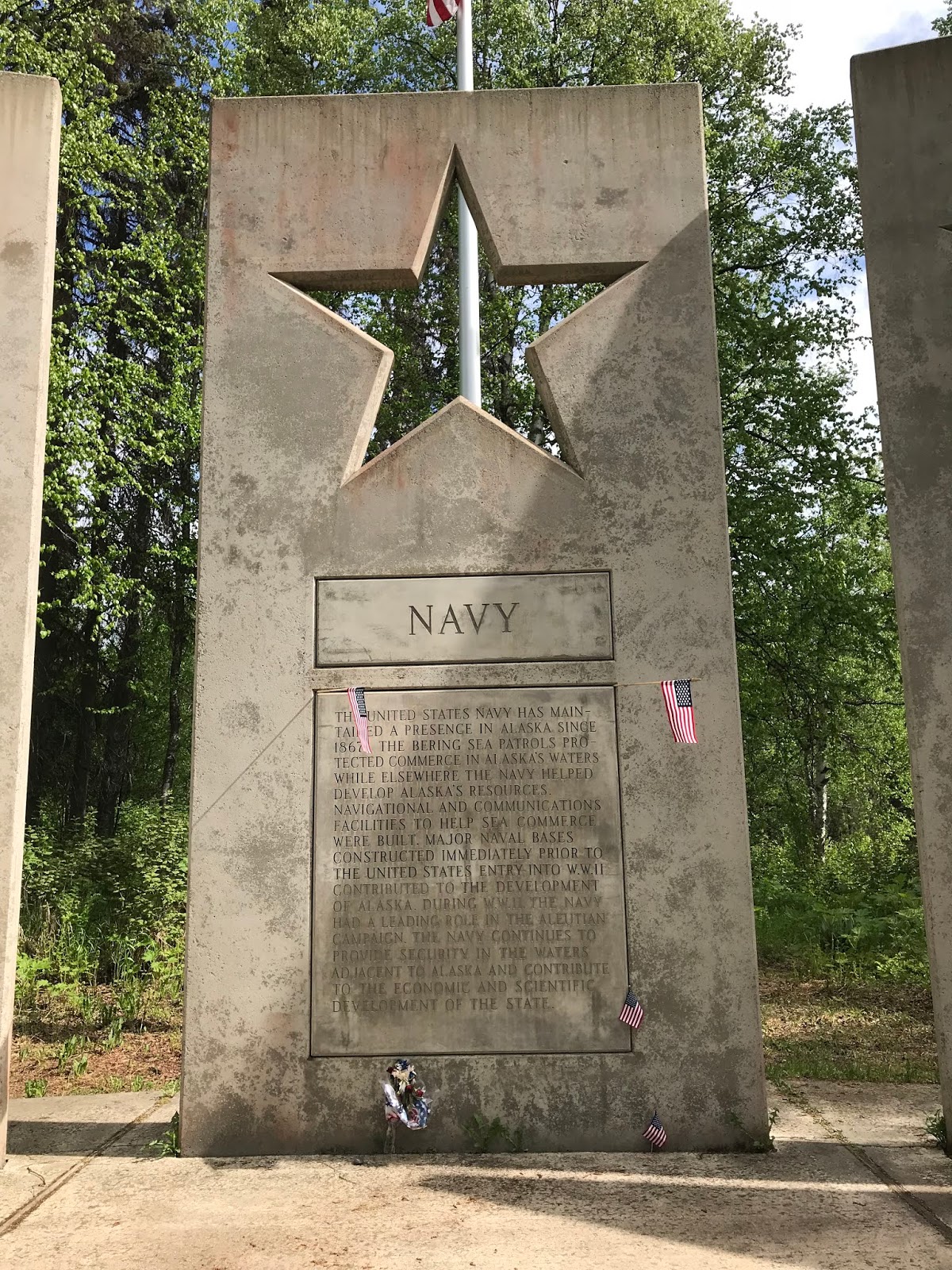 The next stop was the Alaska Veteran’s Memorial with a sculpture at the entrance honoring the 6000 Alaska Territorial Guards made up of native tribes, who were active during World War II. They served as lookouts for further Japanese incursions and otherwise aided the war effort after the Japanese invasion of the Aleutian Islands, thousands of miles northwest of the monument. The statue is set in front of a series of tall slabs, one for each branch of the military. The invasion is a little-known aspect of World War II where 1,000 US troops lost their lives along with all of the 2,000 Japanese invaders (the last by suicide). A dreadful byproduct of the invasion was the evacuation of Native Aleuts from the dry and treeless islands to the rain forest on an island near Sitka, resulting in tuberculosis and deaths. This stop was a somber way to embark on the last leg of the long bus ride.