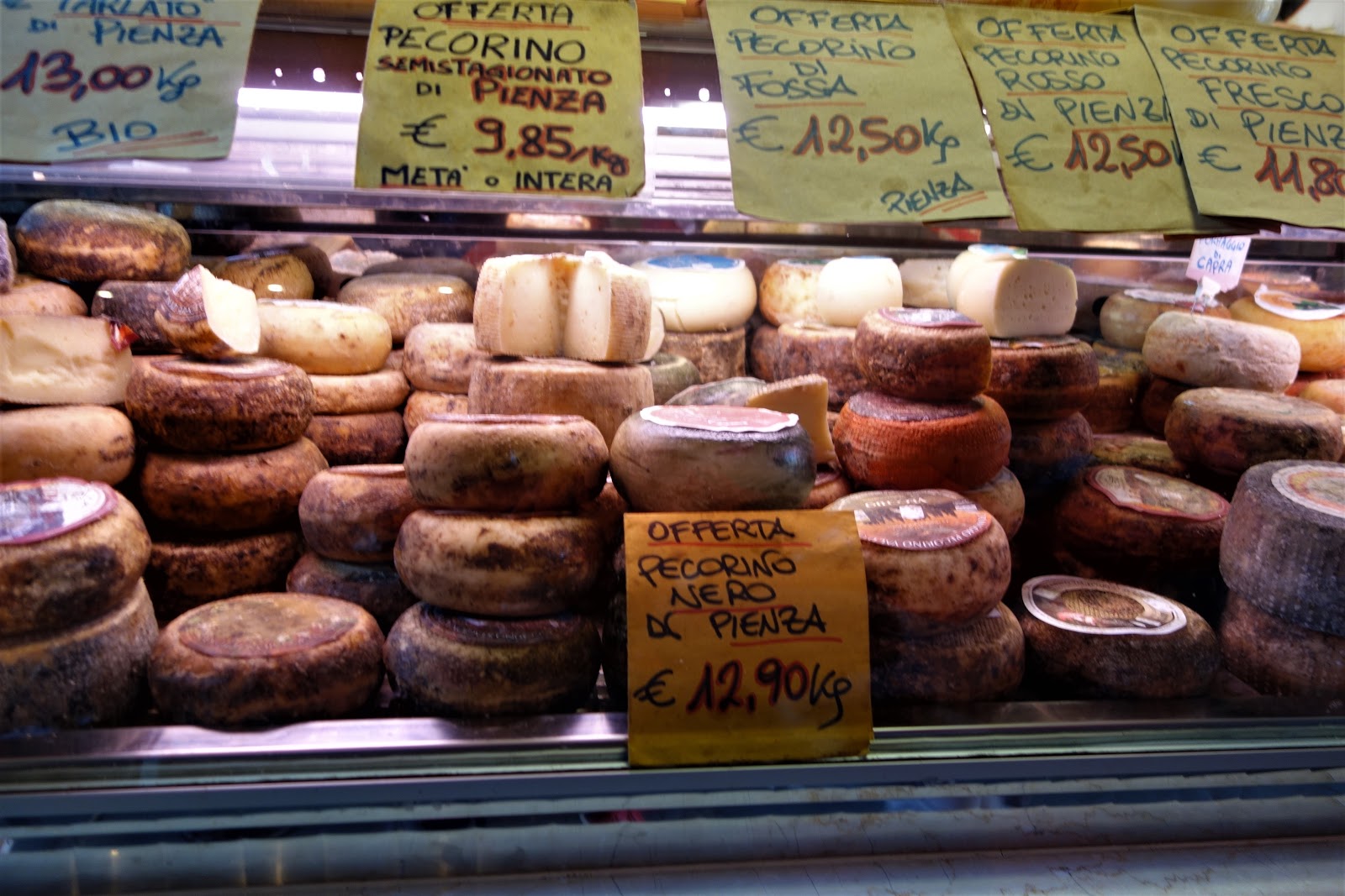 It didn’t take a moment to dive in to enjoy the experience: glistening fresh fruit and vegetables, shoes, aprons and household goods, salamis and other cured meats. After picking out some of the sweet green grapes that ripen late fall we stopped at the cheese truck. The aroma made my mouth water for a taste of pecorino di Pienza, semi-stagionato. The cheese made from sheep’s milk is aged about 3 months and goes nicely with a glass of Chianti. The Roman army dined on it and it’s never lost popularity, especially with me. We bought a half of a round for snacks when we returned to our friend’s home.