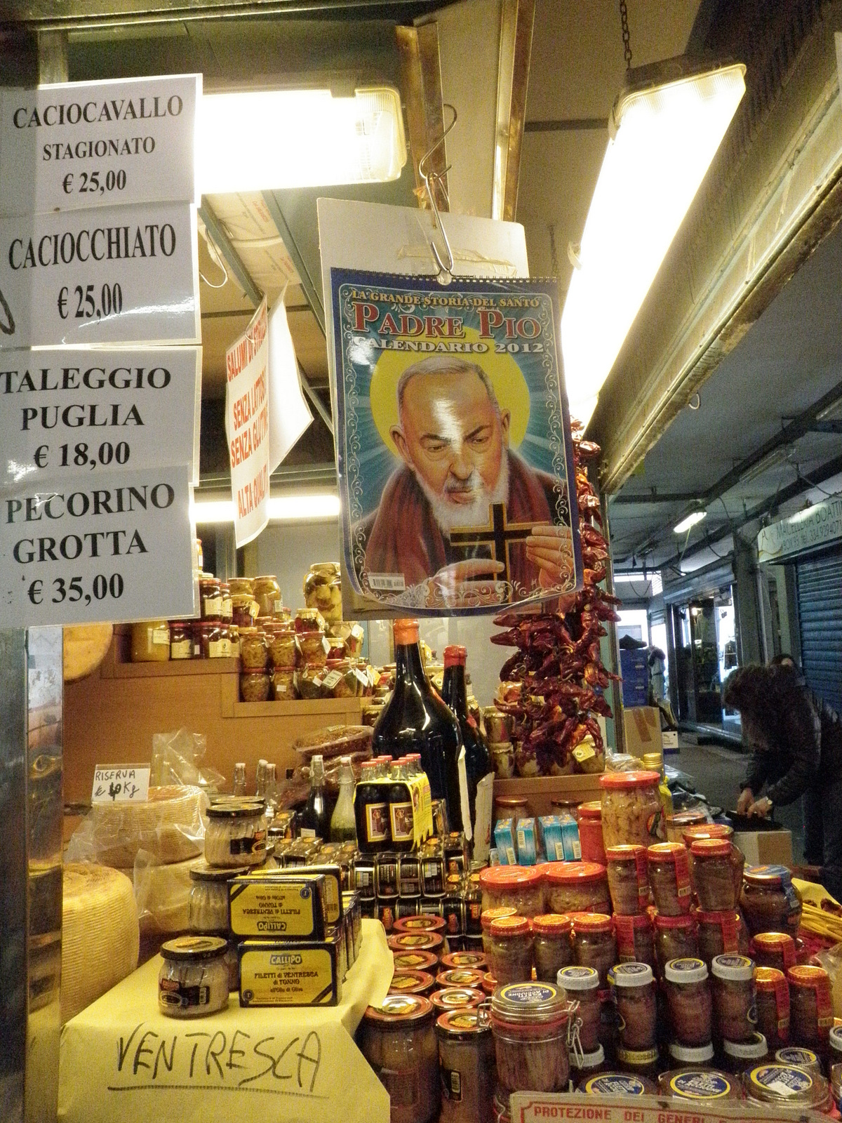 The bustling atmosphere took my mind back into history, to visualize an ancient Roman housewife being harangued by vendors as she tasted a grape, tested a melon for ripeness, and bargained for bread and rough red wine. Or maybe a house slave belonging to a rich matron was looking for stinky fermented fish sauce called garum, roasted parrot, salted jellyfish, oysters, ostrich, or tiny songbirds to be eaten in one crunchy bite. Perhaps dormice served with honey was on the menu for the banquet that ancient Saturday evening. Maybe some shopkeepers shouted out Emperor So-and-So always served his mice with the vendor’s acacia honey. (Today’s shoppers often see stalls with a picture of Padre Pio, a favorite Roman saint, as a recommendation.)