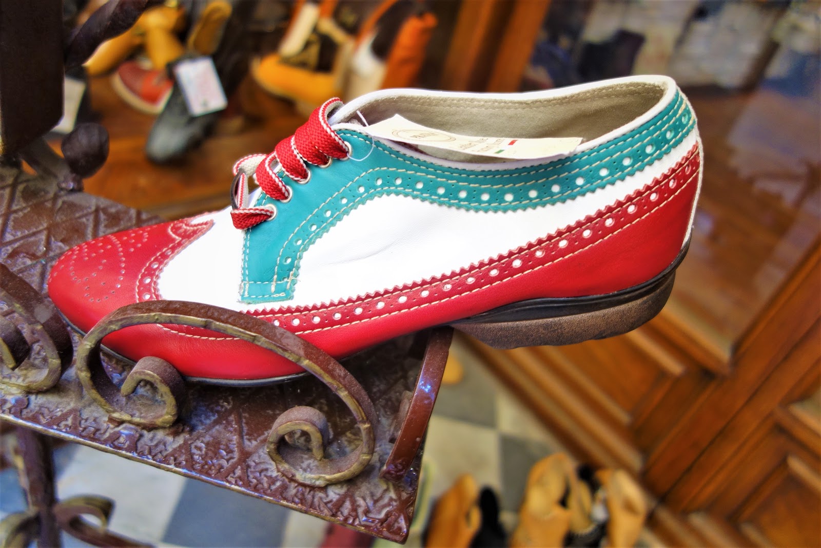 The street is lined with medieval palazzi, narrow and steep lanes leading both up and down the hill, stylish craft shops, art galleries, bars, and a startling shoe store. We paused, gaping at the men’s selection. I asked my husband if he wanted a pair. When he shuddered at the thought of such a daring fashion move, we walked on to the two main piazzas, linked by a narrow walkway.