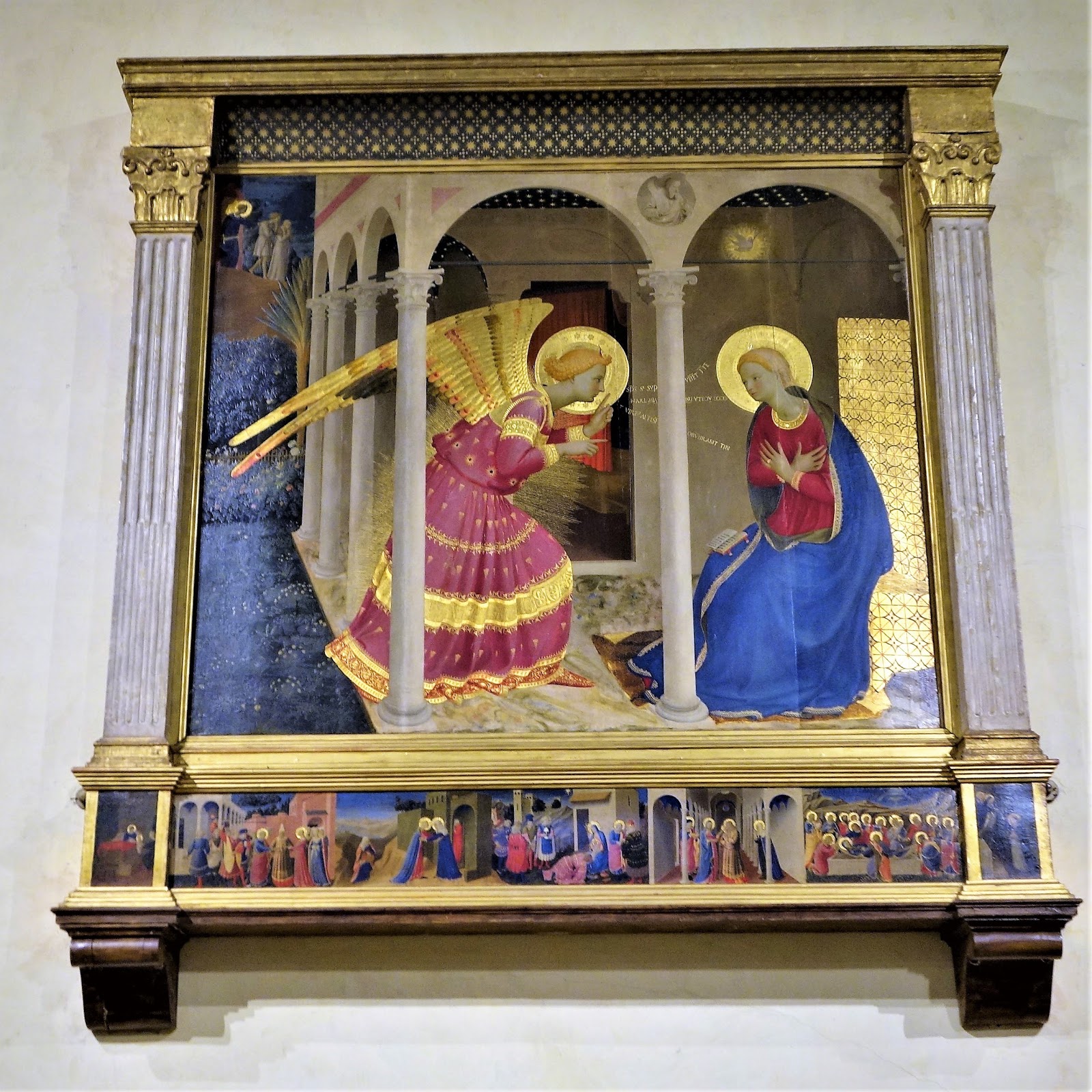 Church of the Jesu, now a museum, holds a lovely collection of Renaissance paintings including the sumptuous Annunciation by Fra Angelico as well as several by Signorelli. The Annunciation is a study in pink and gold with the Archangel Gabriele dominating nearly two-thirds of the picture. Golden-haired Mary wears a dark blue robe over a red dress and recedes into the background as the angel with his huge red and gold wings raised as if on the verge of returning to Heaven, points to her with his right hand and with the left issues the tidings. Mary’s response is also in gold letters.
