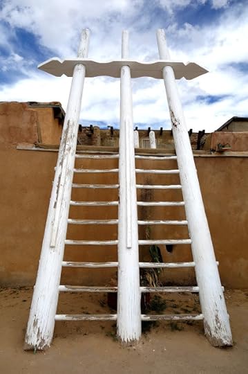 As we strolled, we passed two and three-story homes, some with ladders that lead to kivas, rooms traditionally used for men's religious ceremonies. One ladder had a crosspiece at the top in a cloud shape to encourage rain. Kivas are traditionally built underground, but because the ground is too hard to excavate, Acoma kivas are built on the second story of houses. Our guide, Maria, joked that they were early man caves, which made me wonder if they are actually used any more.