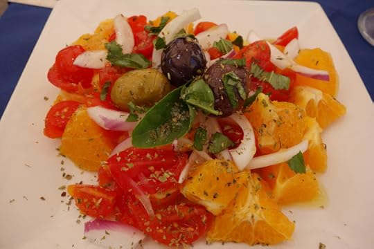 Of course we were hungry afterward. I ordered a salad with the tomatoes mixed with oranges. green and black olives, red onions and topped with a sprig of basil. Divine.