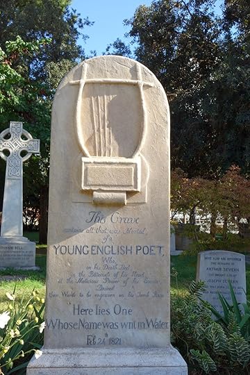 Keats, died at age 25 of tuberculosis in a villa near the Spanish Steps (now a museum). His last request was to be placed under a tombstone bearing no name or date, only the words, "Here lies One whose Name was writ in Water." But the stone, which under a relief of a lyre with broken strings, also includes the epitaph:
