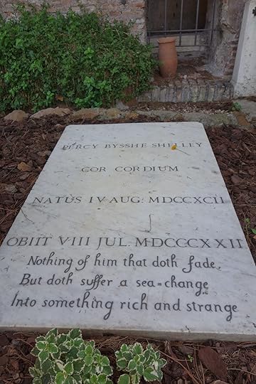 Shelley drowned in 1822 in a mysterious sailing accident near the lovely town of Lerici on the Italian coast south of Genoa. He was cremated on the beach where his body washed ashore, the ashes interred in the crowded main area of the cemetery next to the ancient Aurelian Wall. The inscription reads Cor Cordium ("Heart of Hearts"), and in reference to his death at sea, a few lines of "Ariel's Song" from Shakespeare's The Tempest : "Nothing of him that doth fade / But doth suffer a sea-change / Into something rich and strange."
