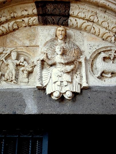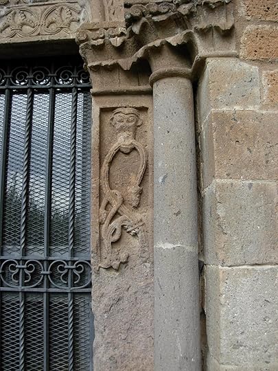 The exterior displays a conglomerate of styles more harmonious to me than that of Santa Maria Maggiore although it also includes pre-Christian carvings. Along with a typical large rose window and the four Evangelists, a plaque showing either an Atlas holding up the world or an Etruscan priest in a worship posture complements the décor. Surrounding one of the two pillared windows sculpted lush vines spring from the mouth of another Green Man.