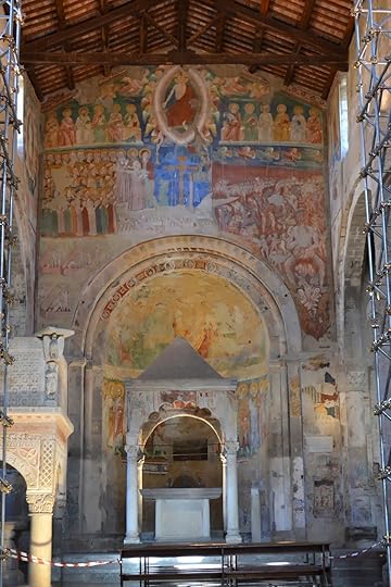 The solemn interior has another selection of marble reminders of the past – from a primitive bishop’s throne and a pulpit assembled from carvings made in many eras, to a beautiful Renaissance-era baptismal font. Taken together, the ensemble shows evidence of labor interrupted and taken up anew. The work continues: a technician, intent on restoring the octagonal font, didn’t look up as we watched his painstaking work to reverse the destructive passage of time and neglect, and scaffolding-lined walls. A few faded frescoes are still visible including an enormous Last Judgment with graphic depictions of tortures so loved by Church fathers for those they consigned to Hell. Too depressing to contemplate on a sunny day when it was nearly lunch time.