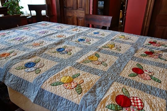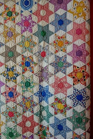The curator decided to use our quilt as a table decoration for the three-month long Spring exhibit, so now it has joined many others made by farm women gathered together around a quilting frame to gossip and stitch fabric scraps from feed and flour sacks during the dark days of the Depression.