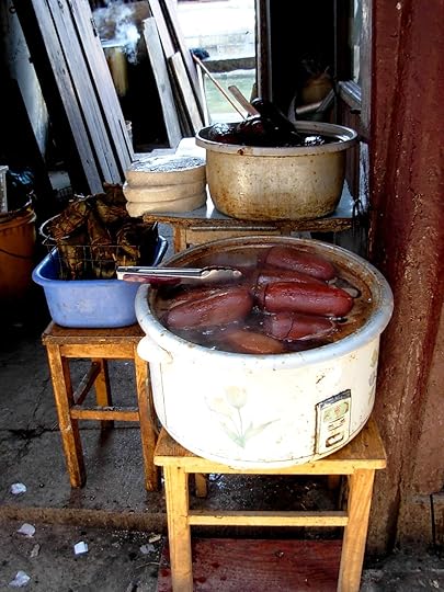 Later, we moved on to the main shopping area filled with tiny shops and a museum with displays about local culture including a kitchen and dining room from an upper-class family and wind-powered rice milling equipment. But lunch time was nearing and pots bubbling away presented some interesting choices.
