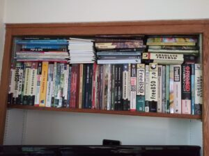 An author’s brag shelf is where they keep one copy of every edition of everything they’ve published. The problem with a practicing writer’s brag shelf is that it needs more and more space. I mean, look at this from 2017.