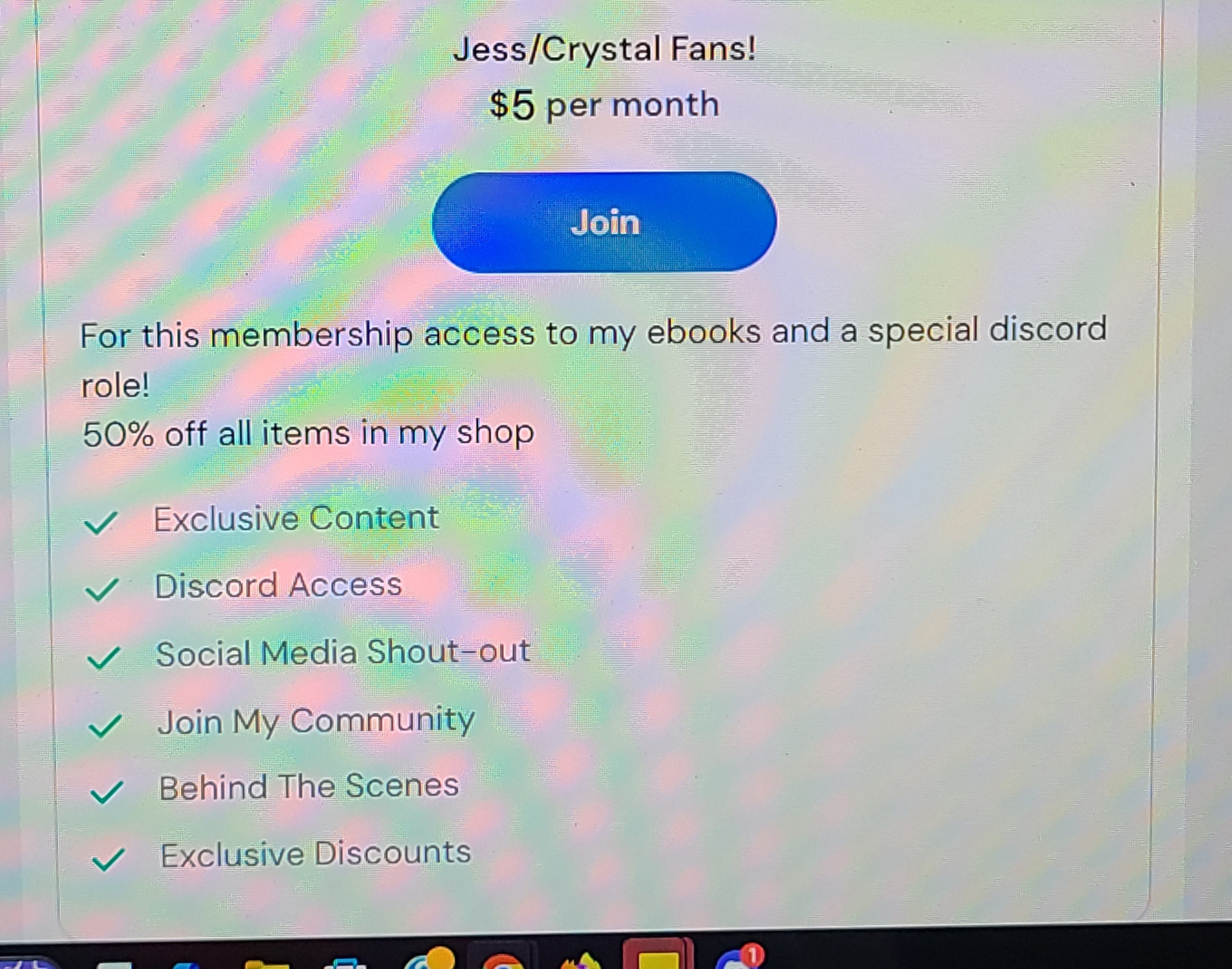 For this membership access to my ebooks and a special discord role! 50% off all items in my shop