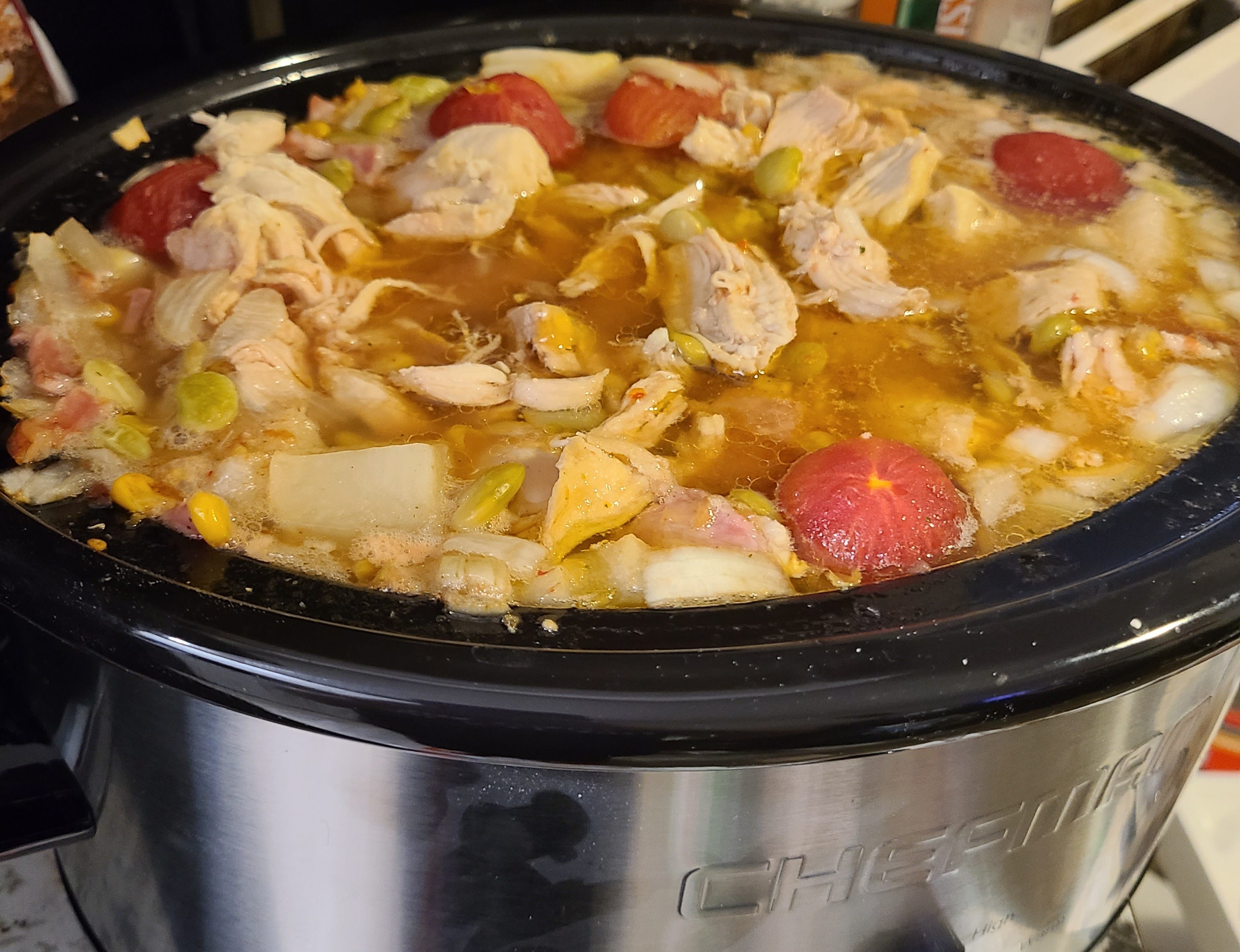Yields 28 cups?? Try cutting in half. That would take 1 lb smoked chicken meat, 1¾ lb smoked pork etc.