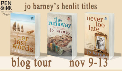Welcome to the tour stop of for blog tour for the author Jo Barney for her three Henlit titles: Her Last Words, The Runaway and Never Too Late. The tour runs from November 9 – 13 and will consist of reviews, guest posts, interviews and excerpts. The full schedule can be seen here.