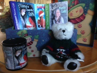 A Christmas mug, a Christmas bear, and the three author's signed Christmas Books: Santa's Pretty Lady, Santa's Secret Gift, Mainland SantaHow to put your name in the drawing, Go to HERE