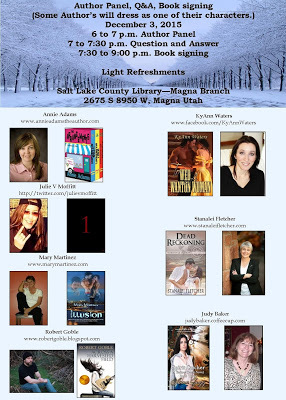 This week several of us authors are having a book signing. If you’re in the area, we’d love to have you stop by. We’re doing a panel for Q&A and several of our authors will be dressed as one of their characters. December 3Salt Lake County Library, Magna Branch 2675 S. 8950 W, Magna, UT.
