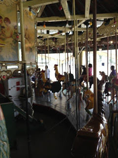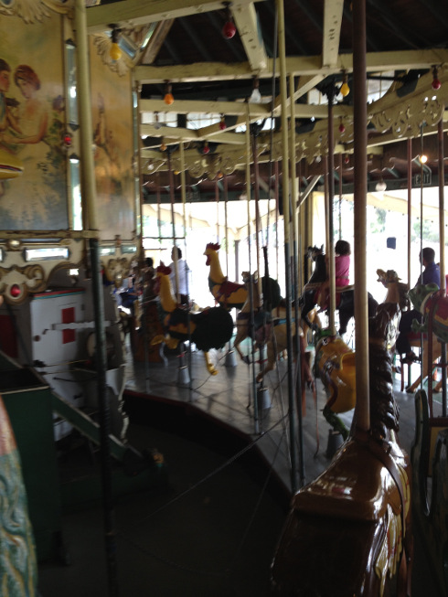 And here's a photo inside as the carousel turns! It was so charming. We were riding the ostriches. You can juuuuust barely see a peek of Dana's next to me. Many off color jokes were made about the roosters ahead of us.