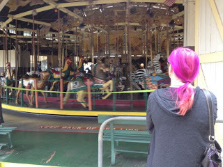 We zeroed in immediately on the San Diego Zoo... and discovered it was 45$ each for a ticket. Frankly, we decided that money could be better spent elsewhere. We immediately lucked out. Circling the zoo, we found an old fashioned carousel. It was beautiful, and the ride was several minutes long. Well worth a couple of bucks. Here we stand waiting for our turn.