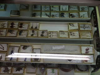 The store that interested us the most was about gemstone crafts, geology, all that kind of thing. One of the lost photos was of their adorable periodicals, but here's the jewelry rack. Warning: The photos from the rock store were kept at very large size, because I felt detail would be important.