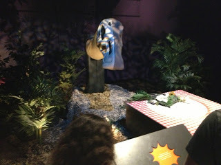Really, really running out of photos here. I don't have any of when we stopped to eat. The big thing we did that day was go to the natural history museum. We saw a fantastic little movie about dinosaurs - fantastic because the dinosaurs had proper feathers. I grew up in a pre-dinosaurs-have-feathers world, and seeing them feathered delights me. Too few dinosaur renditions have caught up with that. But, no photos of the vulture-lookin' velociraptors or the hysterically goofy oviraptor. All disappeared into the ether. All I have is this, a downright creepy photo of a duckbill that's half face, half skull! There was a whole line of heads like this.