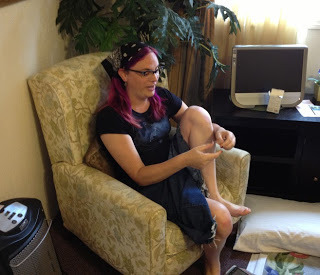 I mentioned the exhaustion repeatedly. We did not spend a huge amount of time at the convention Saturday. We started OUT pooped. As a demonstration, here is Dana Simpson putting a bandage on her toe. So much walking!