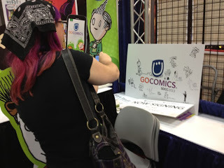 But before we could see him, we stopped by Dana's syndicate's booth, so she could add her sketch to a board their cartoonists were putting together. Here, in an impulse-driven attempt to be meta, is a photograph of the artist photographing her art.