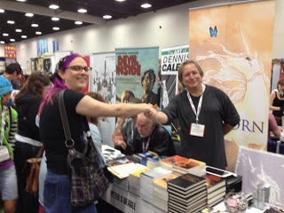We met the Man himself! While I was waiting as he spoke to another fan, Dana shook hands with Beagle's marketing guy, who begged her to attend some of their events. Seriously. I was like 'Damn, girl!' Beagle is the little man under their shaking hands. He is sweet and accidentally took a copy of my books, and hey, he can have 'em. I wish I'd gotten a better picture, because he has the most idiosyncratic expression.