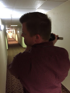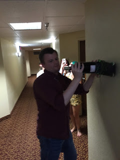 The convention was a total loss from a business perspective, but I met a lot of other CQ authors, and they were the most wonderful women. They had a room party Thursday night, and while I did not get a photo of them shouting profanities at the top of their lungs while laughing, I do have these: The SO of one of the authors attempting a thing he heard about where you can open a wine bottle by putting it in a shoe and thumping it against the wall. It did not work, so he went and got the downstairs bar to open the bottle, which none of us had thought of. I think that means he wins!
