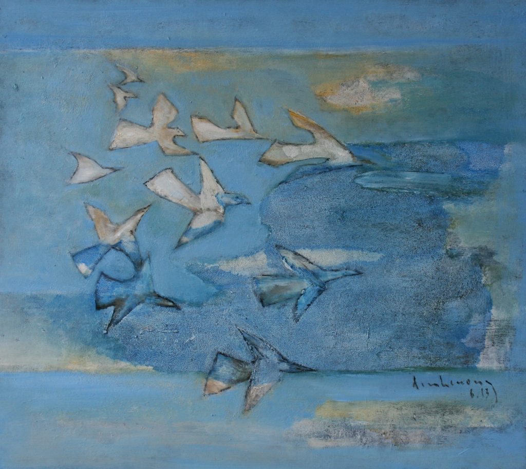 Nhiều mây chim bay không nổi sơn dầu trên giấy plast. 18 x 20 in