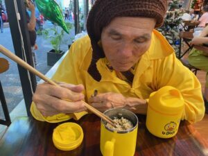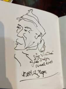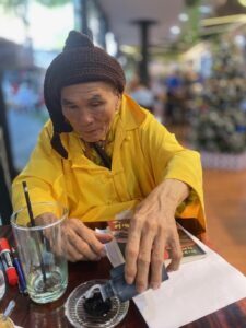 Thầy Viên Thức Đàlạt nhắn gặp ở Đường Sách. Thầy cùng tuổi với mình. Thơ, hoạ, thư pháp… thầy nổi tiếng ai cũng biết. Lúc này thầy đi “tiếu ngạo giang hồ”, từ Nam chí Bắc, với cái xe 4 bánh, có đệ tử đưa đi, tới đâu ăn đó, ngủ đó. Vào quán cà phê Đường Sách giữa Saigon, thầy mặc kệ mọi người, mở túi xách lấy đồ ăn ra ăn, mở lon lấy nước uống ra uống… Mình gởi tặng thầy cuốn Một Ngày Kia… đến bờ, thầy khoái chí quá, cười khà khà rồi mở bị bày nào mực, nào giấy, viết lông, pha chế rồi hí hoáy viết…