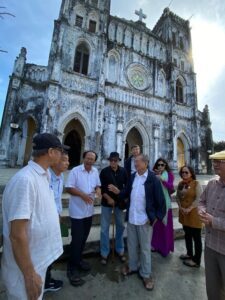 Linh mục Thái hướng dẫn đoàn thăm Nhà thờ Mằng Lăng, cho xem cuốn sách xưa thời Alexandre Rhodes, 400 năm trước, với thứ chữ quấc ngữ đầu tiên của nước ta thật thú vị.