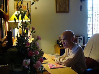 Chúng tôi ngồi ở đó, ban công trước phòng Sư, trông xuống một vườn cảnh nhỏ, gió buổi trưa hiu mát, trái tim tôi như chiếc lá bay. Sư và anh Lữ Kiều, Giai Hoa đang bàn về chương trình buổi ra mắt tập thơ Những Điệp Khúc Cho Dương Cầm, tập thơ tôi được Sư tặng sau đó.