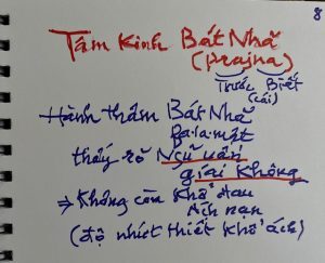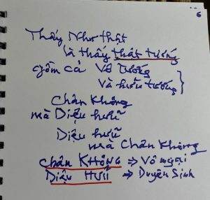 Thí dụ Bát Nhã Tâm Kinh có 600 cuốn, rút gọn còn vài trăm chữ, và cuối cùng tôi chỉ còn học một chữ “Không”. Dễ hiểu lầm chữ Không này là không có gì, mà thực ra vẫn có. “Có” này không do tự tính mà là do tác động của nhiều yếu tố (duyên sinh).