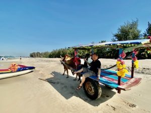 Xe bò đi về phía Chợ Cam Bình. Ở đây hàng ngày có vài chục chiếc xe bò dọc bãi biển trang trí như xe… đám cưới!