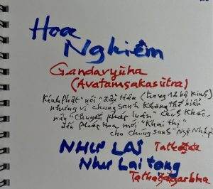Đúng là từ năm 2001, cứ mỗi 5 năm tôi ra một cuốn sách, theo các vấn đề lớn đặt ra từ các kinh Phật. Từ Tâm Kinh, tôi viết cuốn Nghĩ từ trái tim để trả lời các câu hỏi đời sống (Why? Tại sao). Từ kinh Kim Cang, tôi viết cuốn Gươm báu trao tay (để trả lời câu hỏi How – Cách nào). Từ kinh Pháp Hoa, tôi viết Ngàn cánh sen xanh biếc (cho câu hỏi What – Cái gì, Who – Ai). Từ kinh Duy Ma Cật, là cuốn Cõi Phật đâu xa (cho câu hỏi Where – Ở đâu). Và từ kinh Hoa Nghiêm, tôi có nhiều bài bổ sung sau này.