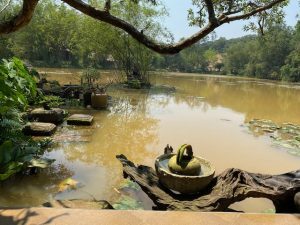 Lần nào đến Huyền Không Sơn Thượng, ngoài được gặp Sư Giới Đức để học hỏi, bao giờ mình cũng ghé thăm một nhà sư trẻ, sư Chơn Quán, ở trong một cái cốc nhỏ giữa hồ, có một cái cầu tre lắc lẻo bắc qua. Sư Chơn Quán trước đây là người phụ trách trang web của HKST giúp Thầy Giới Đức – đã đăng một số bài viết của mình nên đã quen biết nhau – nhưng nay trang web tạm ngưng để tập trung cho Facebook, rộng mở và phù hợp hơn. Facebook ngắn gọn, tương tác nhanh nên tiện lợi hơn Website.