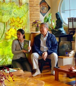 Mình không hẹn trước với Sư. Xưa nay vẫn quen vậy. Cho nên khi gặp Sư, mình nói “Tôi không hẹn trước với Thầy, vì “có duyên” thì gặp cũng tốt, mà không gặp cũng… tốt”. Sư cười. Tay bắt mặt mừng. Sư khác hẳn xưa. Xưa, là hơn 3 năm trước, thấy Sư nghiêm nghị, có vẻ luôn “căng thẳng”. Đó là trước khi Sư nhập thất 3 năm ẩn cư, “để coi có thấy được gì hay không”, có đạt được “quả” gì không. Hôm nay sau 3 năm tu thiền nghiêm nhặt, Sư thấy được chỗ sai chỗ đúng, của Định, của Tuệ, thấy Thiền Định mà không khéo, bước vào đời sống dễ bị 8 ngọn bát phong đập tơi tả. Bây giờ nhìn Sư mình mừng, thấy Thầy thảnh thơi, an nhàn, ung dung, tự tại…