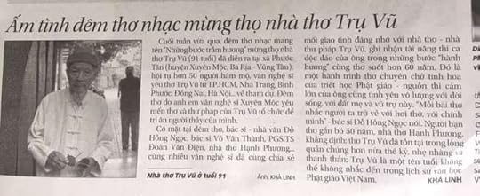 Sáng nay báo Tuổi Trẻ có mấy dòng tin ngắn về buổi Họp mặt mừng tuổi 91 của nhà thơ, nhà thư pháp Trụ Vũ tại Xuyên Mộc, Bà Rịa – Vũng Tàu. Một người bạn từ phương xa đã hỏi thăm. Một vài bạn còn trách sao lâu quá, chẳng thấy thư từ gì cả, chẳng thấy cập nhật gì mới trên dohongngoc.com cả vậy!…