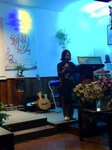 Nhà phê bình văn học Đăng Lan nói về thơ Trụ Vũ. Rất nhiều hoa và quà cho đêm hôm đó.