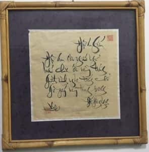 Một bài thơ của ĐHN do Trụ Vũ viết thư pháp (2008): Hôi An sớm/ Hôi An còn ngái ngủ/ Mái chùa ôm vầng trăng/ Giật mình nghe tiếng chổi/ Gà gáy vàng trong sương (ĐHN)