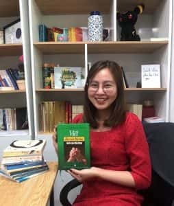 Thu Thảo WEWE đang cầm trên tay cuốn Viết cho các bà mẹ sinh con đầu lòng, NXB Tổng hợp Tp. HCM thực hiện. Cuốn sách được cập nhật hàng năm. Bìa Mai Quế Vũ. Trên bàn là số sách ĐHN được chọn để làm Sách Nói.