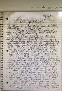 Giờ xin nói chuyện “trước tác” của tôi nhe. Tôi mê văn thơ từ hồi nhỏ, đọc gần hết tủ sách trong một tiệm cho mướn sách ở Phan Thiết. Cô Hai tôi ( xe lửa trúng mìn, gãy cả 2 chân) cư ngụ trong một ngôi chùa nhỏ,thường kêu tôi đi mướn sách về cho cô đọc, nhưng lại cấm tôi đọc vì con nít đọc truyện không tốt, mê, bỏhọc. Mỗi lần đi mướn truyện, tôi lén đọc hết dọc đường đi, có khi ngồi gốc cây đọc xong mới về.Tôi còn ghi chép tóm tắt nội dung, các nhận xét của mình vào một cuốn vở.Tôi nhớ những bài văn của mình hồi học lớp Nhứt (lớp 5) thường được thầy khen và đọc trước lớp.Rồi cậu tôi là ông Ngu Í Nguyễn Hữu Ngư làm báo ở Saigon về thăm, cho một đống sách báo, tranh ảnh.Tôi mê tít.