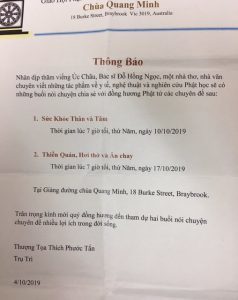 Thầy Phước Tấn trụ trì chùa Quang Minh ở Melbourne “đặt hàng” cho mình 2 đề tài trong dịp này. Thường nhà chùa tổ chức các buổi “Talk” cho các khách mời vào buổi sáng, ngày cuối tuần thuận tiện hơn, nhưng do lần này mình kẹt lịch nên phải tổ chức vào 2 buổi tối, ngày thứ Năm trong tuần, trời lạnh, hy vọng sẽ “ế”.