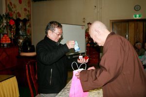 Sau buổi Trò chuyện, thầy Phước Thiền thay mặt chùa Quang Minh gởi tặng món quà đến “diễn giả”: hai hủ mật ong nhỏ do chùa sản xuất và một gói trà.