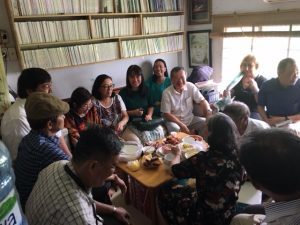 Không hẹn nhau, mỗi bạn mang một món: bia, rượu, xôi gói bánh tráng phồng, thịt nướng, bắp xảo, măng cụt, bánh các kiểu, bánh mì pâté, hoa hướng dương….bàn không đủ chất, cũng là vui.